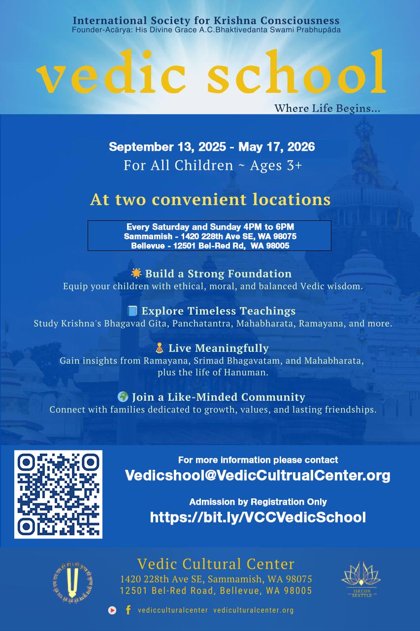 Please email vedicschool@vedicculturalcenter.org for any questions you may have. If you any financial constraints, please email your details to apply for scholarship.