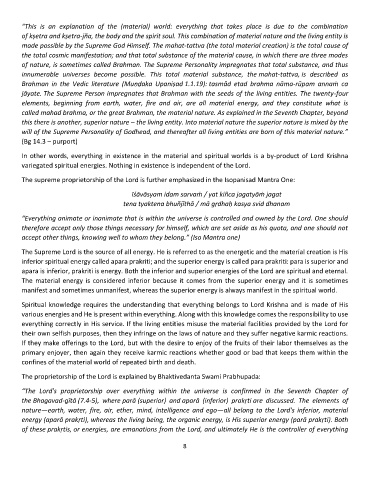 “Everything animate or inanimate that is within the universe is controlled and owned by the Lord. One should