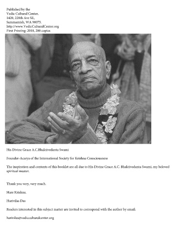 The inspiration and contents of this booklet are all due to His Divine Grace A.C. Bhaktivedanta Swami, my beloved