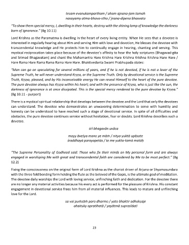 obstacles, the pure devotee continues service without hesitation, fear or doubts. Lord Krishna describes such a