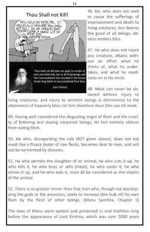 11 any out thinks takes, tained beings sen ent a ainment of heavenly bliss; let him therefore shun (the use of) meat. 49. Having well considered the disgus ng origin of flesh and the cruel- ty of fe ering and slaying corporeal beings, let him en rely abstain given rule (#27 meat like a Pisaca (eater of raw flesh), becomes dear to men, and will 51. He who permits the slaughter of an animal, he who cuts it up, he he (meat),
