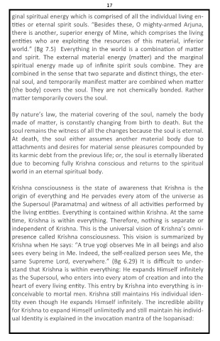 17 ginal spiritual energy which is comprised of all the individual living en- es or eternal spirit souls. “Besides these, O mighty-armed Arjuna, there is another, superior energy of Mine, which comprises the living world.” (Bg 7.5) Everything in the world is a combina on of ma er infinite combined in the sense that two separate and dis nct things, the eter- nal soul, and temporarily manifest ma er are combined when ma er (the body) covers the soul. They are not chemical