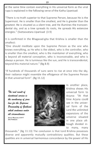 19 at the same me contain everything in His universal form as the virat “There is no truth superior to that Supreme Person, because He is the Supermost. He is smaller than the smallest, and He is greater than the greatest. He is situated as a silent tree, and He illumines the transcen- dental sky, and as a tree spreads its roots, He spreads His extensive It is confirmed in the Bhagavad-gita that Krishna is smaller than the knows everything, as He who is the oldest, who is t