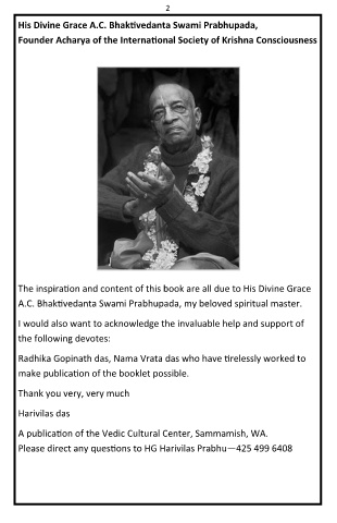 2 His Divine Grace A.C. Bhak vedanta Swami Prabhupada, Founder Acharya of the Interna onal Society of Krishna Consciousness The inspira on and content of this book are all due to His Divine Grace A.C. Bhak vedanta Swami Prabhupada, my beloved spiritual master. I would also want to acknowledge the invaluable help and support of Radhika Gopinath das, Nama Vrata das who have relessly worked to A publica on of the Vedic Cultural Center, Sammamish, WA. Please direct a