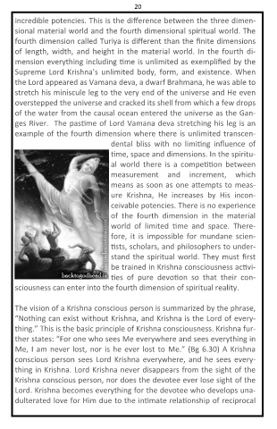 20 incredible potencies. This is the difference between the three dimen- sional material world and the fourth dimensional spiritual world. The fourth dimension called Turiya is different than the finite dimensions of length, width, and height in the material world. In the fourth di- mension everything including me is unlimited as exemplified by the Supreme Lord Krishna’s unlimited body, form, and existence. When the Lord appeared as Vamana deva, a dwarf Brahmana, he was