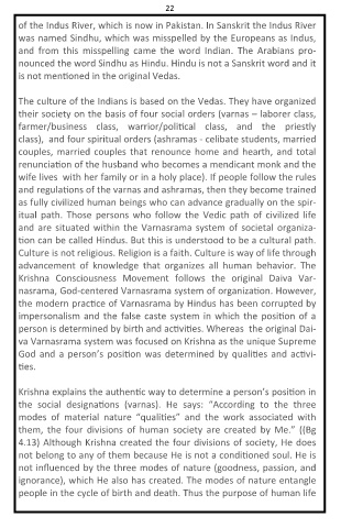 22 of the Indus River, which is now in Pakistan. In Sanskrit the Indus River was named Sindhu, which was misspelled by the Europeans as Indus, the nounced the word Sindhu as Hindu. Hindu is not a Sanskrit word and it The culture of the Indians is based on the Vedas. They have organized their society on the basis of four social orders (varnas – laborer class, warrior/poli cal class), and four spiritual orders (ashramas - celibate students, married couples, married coup