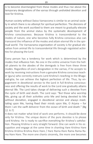 23 is to become disentangled from these modes and thus rise above the temporary designa ons of the varnas through undivided devo on and Human society without Daiva Varnasrama is similar to an animal socie- ty in which there is no a empt for spiritual perfec on. The divisions of society and the work ascribed to them are meant to gradually elevate modes of nature, one who becomes fully Krishna conscious also can transcend the influence of the modes and a ain eternal life in th