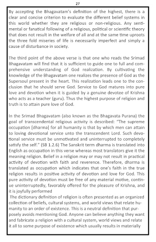 27 clear and concise criterion to evaluate the different belief systems in religious mental or fana cal following of a religious, poli cal or scien fic theory that does not result in the welfare of all and at the same me uproots is The third point of the above verse is that one who reads the Srimad Bhagavatam will find that it is sufficient to guide one to full and com- God knowledge of the Bhagavatam one realizes the presence of God as the Supersoul present in the hea