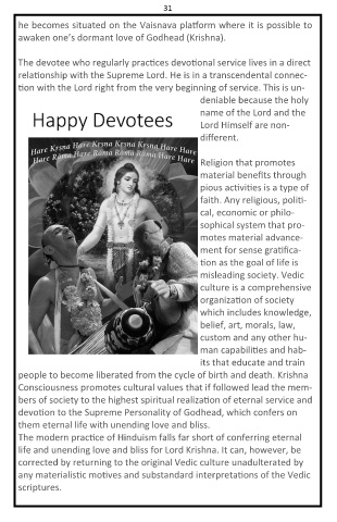 deniable because the holy name of the Lord and the Lord Himself are non- different. Religion that promotes material benefits through pious ac vi es is a type of faith. Any religious, poli - cal, economic or philo- sophical system that pro- motes material advance- ment for sense gra fica- on as the goal of life is misleading society. Vedic culture is a comprehensive organiza on of society which includes knowledge, belief, art, morals, law, cus