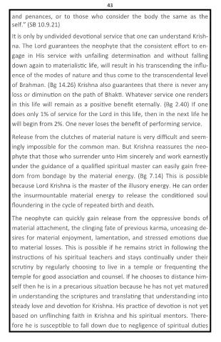 43 It is only by undivided devo onal service that one can understand Krish- na. The Lord guarantees the neophyte that the consistent effort to en- down again to materialis c life, will result in his transcending the influ- ence of the modes of nature and thus come to the transcendental level of Brahman. (Bg 14.26) Krishna also guarantees that there is never any loss or diminu on on the path of Bhak . Whatever service one renders in this life will remain as a posi ve bene