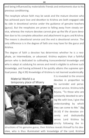 44 and being influenced by materialis c friends and en cements due to his The neophyte whose faith may be weak and the mature devotee who has achieved pure love and devo on to Krishna are both engaged side by side in devo onal service under the guidance of genuine teachers (gurus). But the neophytes are prone to falling away from steady ser- vice, whereas the mature devotee cannot give up the life of pure devo- on due to his complete a rac on and a achment to guru and Krishn