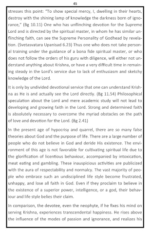 45 stresses this point: “To show special mercy, I, dwelling in their hearts, destroy with the shining lamp of knowledge the darkness born of igno- rance,” (Bg 10.11) One who has unflinching devo on for the Supreme Lord and is directed by the spiritual master, in whom he has similar un- flinching faith, can see the Supreme Personality of Godhead by revela- on. (Svetasvatara Upanisad 6.23) Thus one who does not take person- al training under the guidance of a bona fide spiritual m