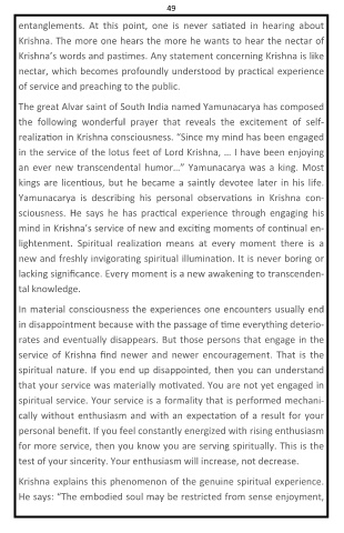49 Krishna. The more one hears the more he wants to hear the nectar of Krishna’s words and pas mes. Any statement concerning Krishna is like nectar, which becomes profoundly understood by prac cal experience The great Alvar saint of South India named Yamunacarya has composed realiza on in Krishna consciousness. “Since my mind has been engaged in the service of the lotus feet of Lord Krishna, … I have been enjoying an ever new transcendental humor…” Yamunacarya was a kin