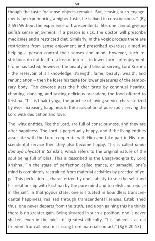 50 though the taste for sense objects remains. But, ceasing such engage- ments by experiencing a higher taste, he is fixed in consciousness.” (Bg 2.59) Without the experience of transcendental life, one cannot give up medicines and a restricted diet. Similarly, in the yogic process there are senses stric ons do not lead to a loss of interest in lower forms of enjoyment. If one has tasted, however, the beauty and bliss of serving Lord Krishna - the reservoir of all kno