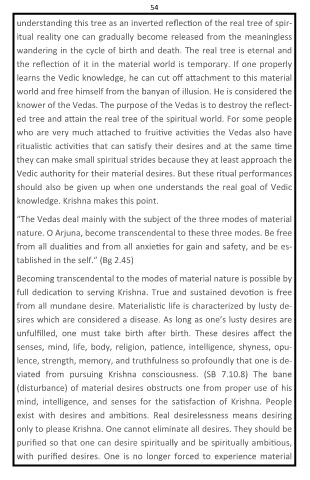 54 understanding this tree as an inverted reflec on of the real tree of spir- itual reality one can gradually become released from the meaningless wandering in the cycle of birth and death. The real tree is eternal and the reflec on of it in the material world is temporary. If one properly learns the Vedic knowledge, he can cut off a achment to this material world and free himself from the banyan of illusion. He is considered the knower of the Vedas. The purpose of the Vedas i