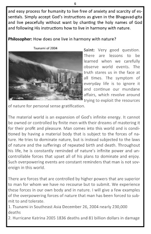 6 and easy process for humanity to live free of anxiety and scarcity of es- sen als. Simply accept God’s instruc ons as given in the Bhagavad-gita and live peacefully without want by chan ng the holy names of God and following His instruc ons how to live in harmony with nature. Philosopher: How does one live in harmony with nature? The material world is an expansion of God’s infinite energy. It cannot be owned or controlled by finite men with their dreams of mast