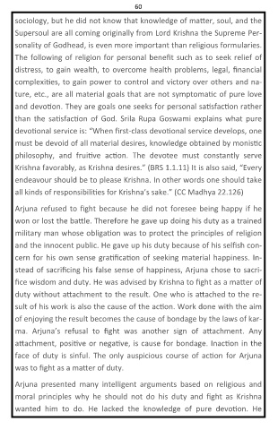 60 sociology, but he did not know that knowledge of ma er, soul, and the Supersoul are all coming originally from Lord Krishna the Supreme Per- sonality of Godhead, is even more important than religious formularies. The following of religion for personal benefit such as to seek relief of distress, to gain wealth, to overcome health problems, legal, financial complexi es, to gain power to control and victory over others and na- ture, etc., are all material goals that are not sy