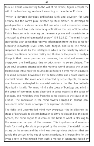 unflinching Krishna and the Lord’s pure devotee spiritual master, he develops all good quali es of a divine person. But one who is not a commi ed devo- tee of the Lord has only material qualifica ons that are of li le value. This is because he is hovering on the mental plane and is certain to be a racted by the glaring material energy.” (SB 5.18.12) The mind is con- sidered the sixth sense that receives informa on from the five sense for acquiring knowledge (eyes, e