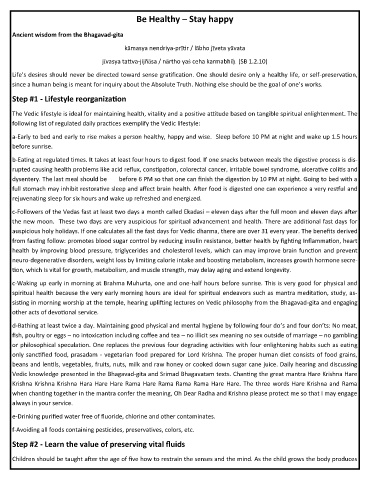 Vedic knowledge presented in the Bhagavad-gita and Srimad Bhagavatam texts. Chanting the great mantra Hare Krishna Hare