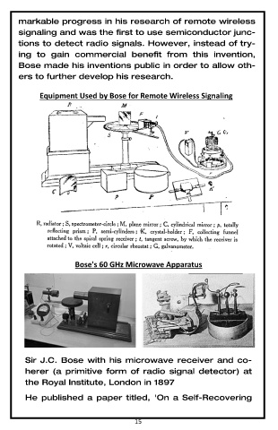 gain commercial benefit Bose made his inventions public in order to allow oth- ers to further develop his research. Equipment Used by Bose for Remote Wireless Signaling Bose's 60 GHz Microwave Apparatus Sir J.C. Bose with his microwave receiver and co- herer (a primitive form of radio signal detector) at the Royal Institute, London in 1897 He published a paper titled, 'On a Self-Recovering 15