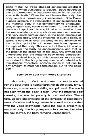 found in when he claimed that plants, like animals, adjusted to "inherited memory of the insisted that not only could no line be drawn between plants and animals but that his researches had shown there was no line between living and nonliving matter. He felt that he had substantiated in the laboratory the Vedic understanding that the whole material uni- verse is animated because of the presence of innu- merable and individual living entities (jivatma) and the