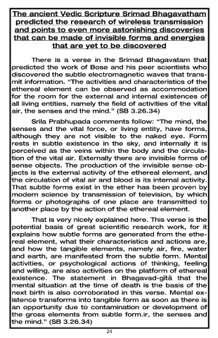 verse in the Srimad predicted the work of Bose and his peer scientists who discovered the subtle electromagnetic waves that trans- mit information. “The activities and characteristics of the observed as for the room for the external and internal existences of all living entities, namely the field of activities of the vital Srila Prabhupada comments follow: “The mind, the the vital force, or living entity, have forms, visible to the perceived as the ve