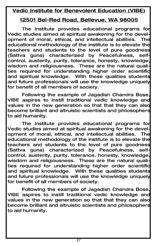and educational methodology of the institute is to elevate the guna) characterized by Peacefulness, self- control, austerity, purity, tolerance, honesty, knowledge, wisdom and religiousness. These are the natural quali- With and future professionals will use the knowledge uniquely Following the example of Jagadish Chandra Bose, traditional vedic values in the new generation so that that they can also become brilliant and altruistic scientists and philo